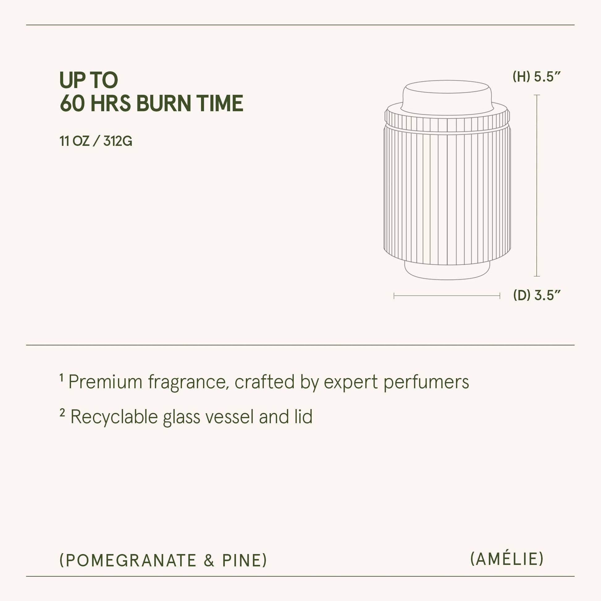 Elevate your space with the La Jolie Muse Amélie Collection: Timeless ribbed glass candles, reminiscent of the Acropolis grandeur. Available in calming colors, they offer a sustainable 60-hour burn with natural soy wax and seamlessly become elegant keepsake containers. Pine and pomegranate are the unlikely duo you soon won’t want to live without. For those cool mornings, golden afternoons, or crisp evenings, this deep and fruity fragrance provides comfort and pure calm. Top notes of bright mandarin orange and pomegranate are highlighted by the cool, refreshing elements of camphorous eucalyptus. At the heart sits spicy cinnamon and clove: two delightful spices that feel like home. Finally, at the base, sits incense, warm amber, and woody fir balsam for a deeply relaxing and calming aroma. Top Notes: Mandarin Orange, Pomegranate, and Eucalyptus Heart/Middle Notes: Cinnamon, Clove, and Fir Needle Base Notes: Fir Balsam, Incense, and Amber